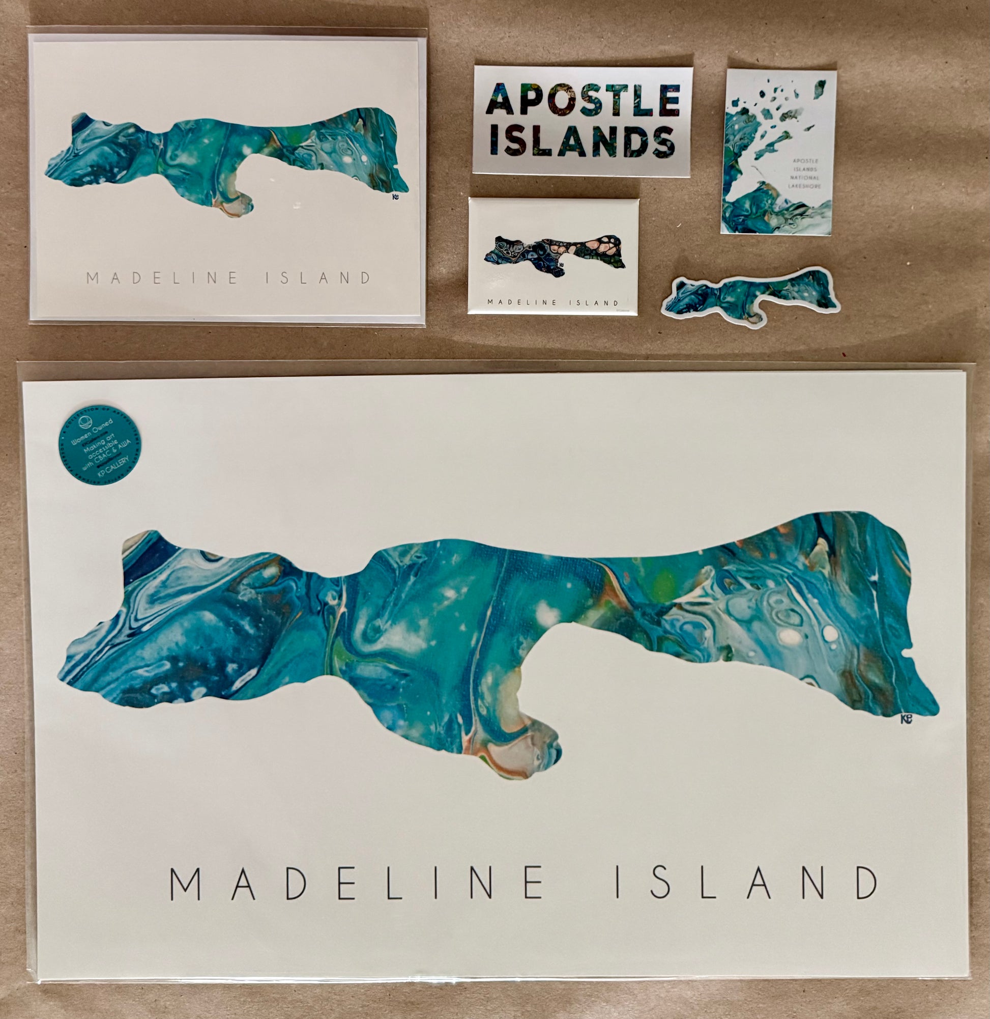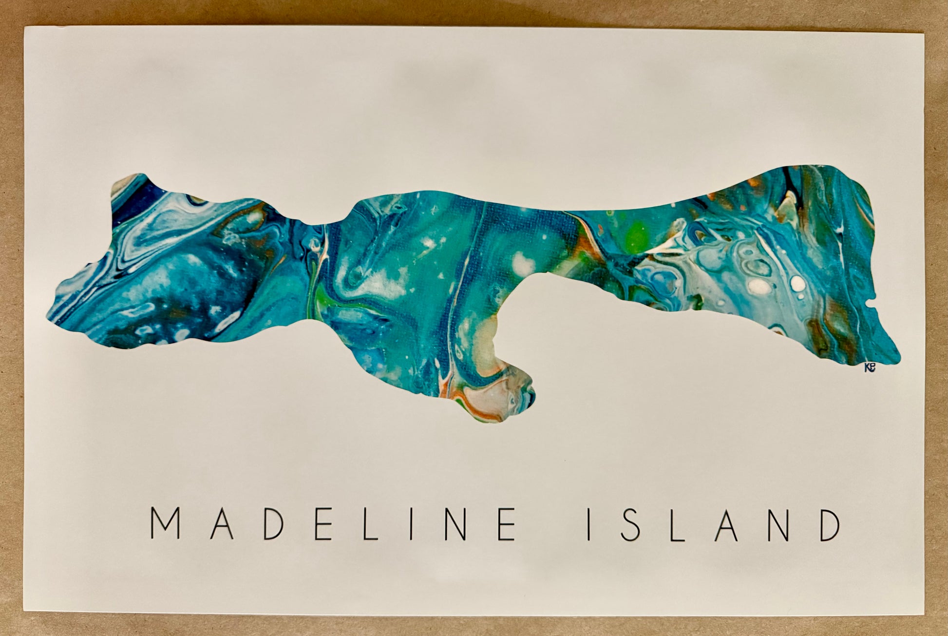 Madeline Island Teal Design Text: "MADELINE ISLAND" design 11 x 17 Print. Comes packaged with print & sturdy chipboard inside a protective plastic sleeve.